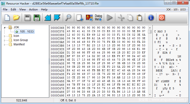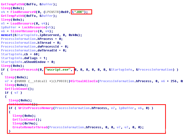 该样本从资源JOK获取数据并注入到一个自启的wscript进程中执行: