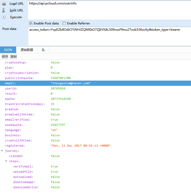 使用得到的Key请求pcloud可以获取网盘的注册人信息,注册邮箱为cheseolum@naver.com,注册时间为2017年12月11日: