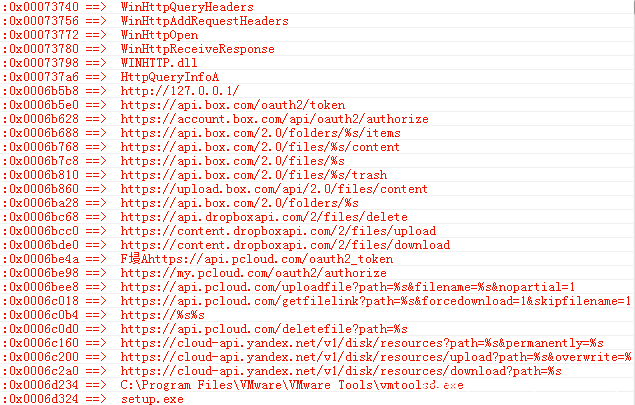 被Shellcode加载到内存中执行的恶意代码是一个EXE程序,为ROKRAT家族后门远控。该样本会通过网盘上传数据,网盘的API Key会内置在样本数据里,下图为提取到的字符串的信息,样本会通过API调用4个国外主流的网盘包括:pcloud、box、dropbox、yandex