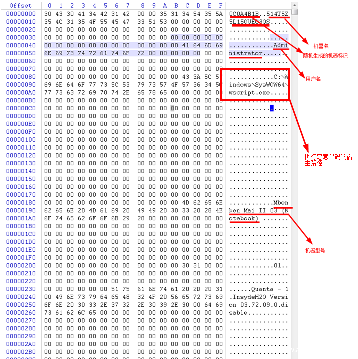 文件前部的数据为机器的型号和机器名信息以及执行起恶意代码的宿主路径: