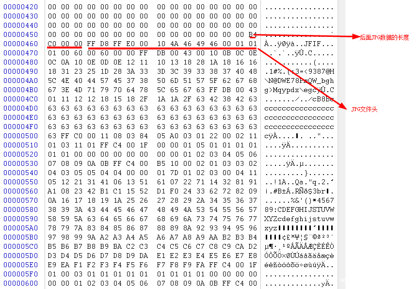 从文件的偏移0x45F开始的为图片的数据结构信息,后面包括4个字节的图片长度及后续的图片内容数据: