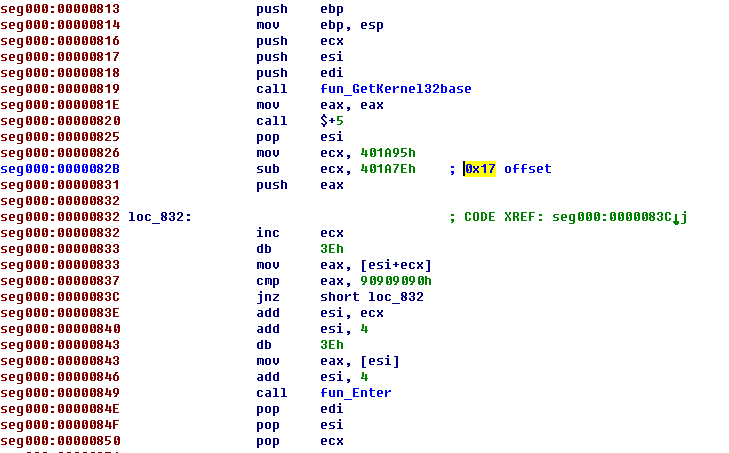 Shellcode2首先获取Kernel32基址,之后通过90909090标记找到后续需要解密的PE文件地址: