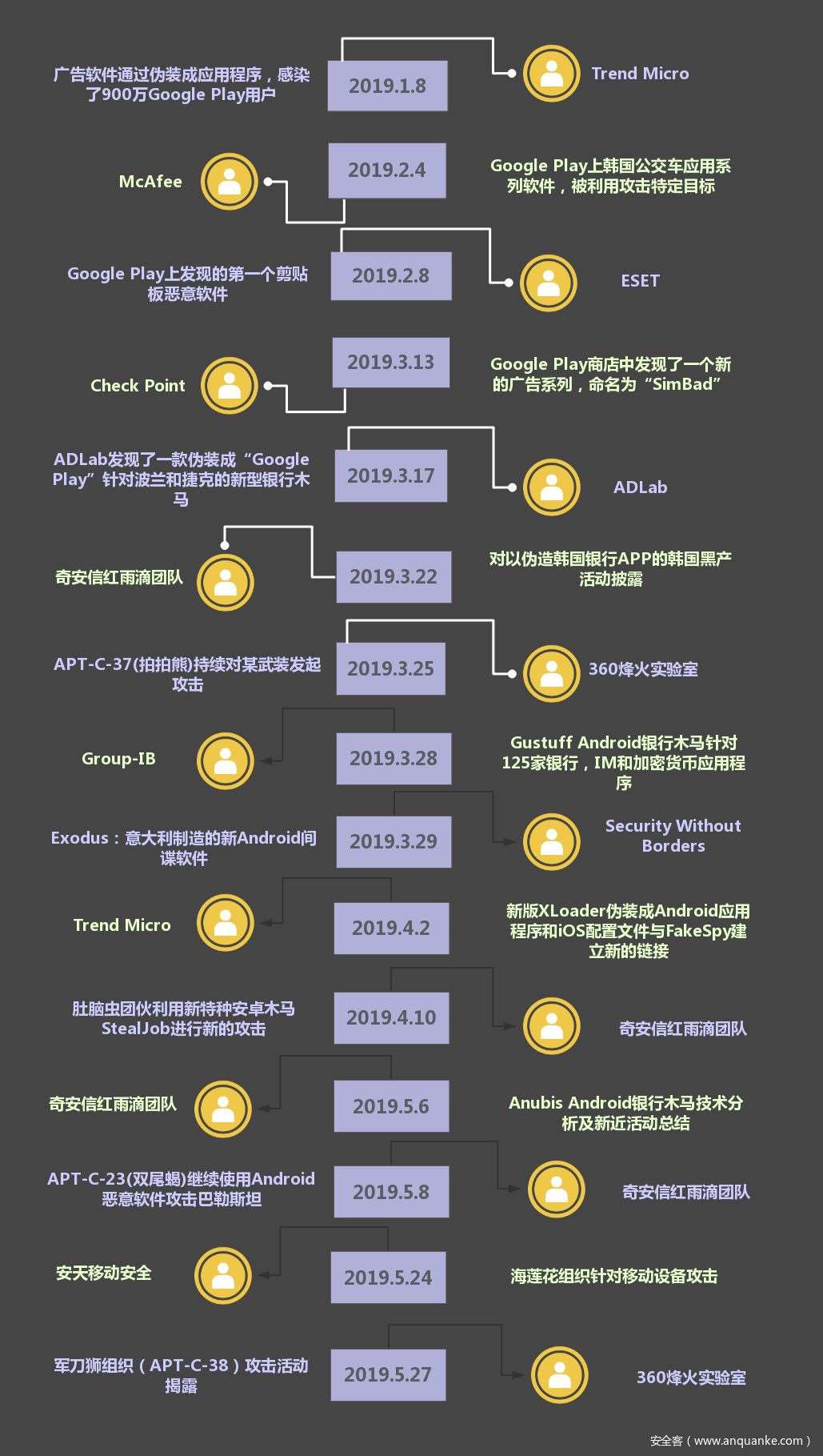 基于2019年上半年国内外各安全研究机构、安全厂商披露的Android平台相关威胁活动的公开资料,结合奇安信威胁情报中心红雨滴团队(RedDripTeam,@RedDrip7)的深入挖掘与跟踪,在本报告中总结一下国内外部分重大Android平台安全事件,使我们对Android平台的威胁图景有个初步的了解。