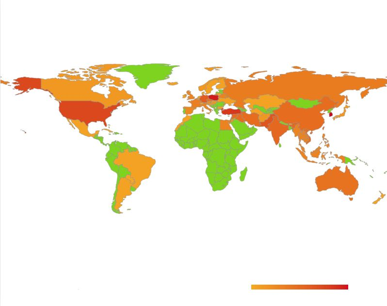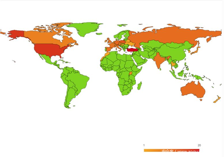 我们对2019年上半年重大的Android事件进行统计,Android平台上的恶意事件以金融银行类恶意程序居多,其次的为定向攻击相关,受影响的国家分布如下图: