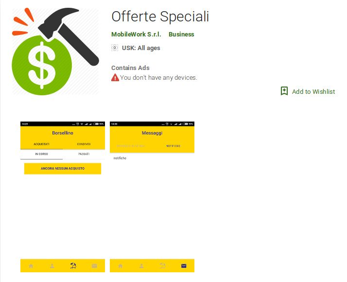 SecurityWithout Borders在GooglePlay中收集了2016年到2019年初的大量样本,他们发现Exodus是由意大利一家名为eSurv从事视频监控的公司开发的,其在Google Play中伪装为移动运行商的应用程序,页面与诱饵都是意大利语,通过GooglePlay公开的数据显示,最多的一个下载量达到了350个,目前这些软件都已从Google Play中删除。