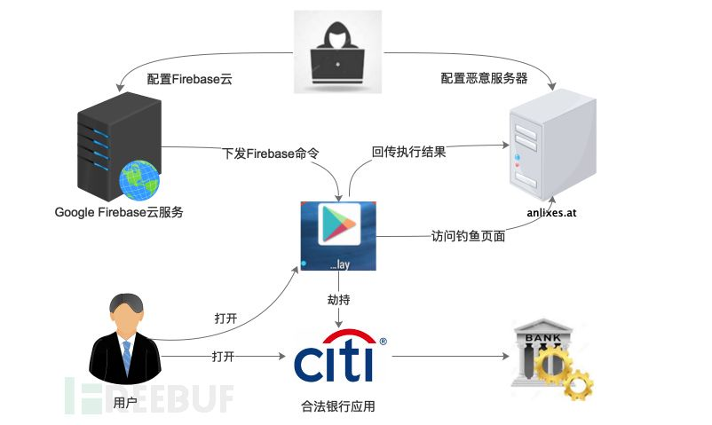 BankThief感染目标设备后,首先通过无障碍服务(无障碍服务是辅助身体不便或者操作不灵活的人来操作手机应用的,其可以被用于监控手机当前活动APP界面,实现对目标界面自动化操作。)监控感染设备。当监控到目标银行应用被打开时,银行木马会启动对应的伪装好的钓鱼页面覆盖掉真实的银行APP界面,在受害用户没有察觉的情况下窃取其银行登录凭证,“BankThief”会进一步将自身设置成默认短信应用来拦截银行短信,这样就绕过了基于SMS短信的双因素验证机制。其次,“BankThief主要利用Google Firebase 云消息传递服务(Google Firebase 云消息传递服务是Google提供的能帮助开发者快速写出Web端和移动端应用通信的一种服务)来对感染设备进行远控,包含清空用户数据、卸载指定应用等恶意操作以及劫持包括花旗银行在内的数十家银行APP应用的恶意行为。