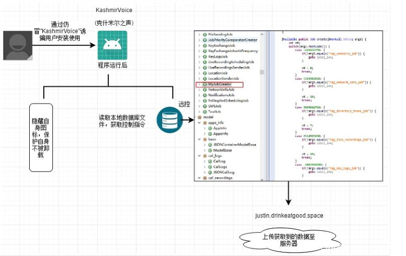 本次红雨滴团队发现的APK样本名为 “KashmirVoice”(克什米尔之声),样本名称通过仿冒为“KashmirVoice”(克什米尔之声),诱骗用户安装,当样本运行以后,会进行多达20种远控操作,其中包含测试操作,其远控操作有:获取用户手机通讯录、用户手机短信、用户手机通话记录、用户地理位置、用户手机文件、用户手机已安装软件等并进行上传。