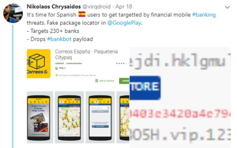 2019年5月6日,奇安信红雨滴团队(RedDrip),经过分析国外安全研究者发现的一款仿冒为西班牙邮政运营商Correos的恶意软件,发现该恶意软件为Anubis银行木马。