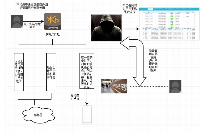 KBuste攻击平台主要为Android,攻击目标锁定为韩国银行APP使用者,攻击手段为通过仿冒多款韩国银行APP,在诱骗用户安装成功并运行的前提下,窃取用户个人信息,并远程 控制用户手机,以便跳过用户直接与银行连线验证,从而窃取用户个人财产。红雨滴团队一共捕获了55种的同家族Android木马,在野样本数量高达118个,并且经过关联分析,红雨滴团队还发现,该黑产团伙使用了300多个用于存放用户信息的服务器从事黑产。