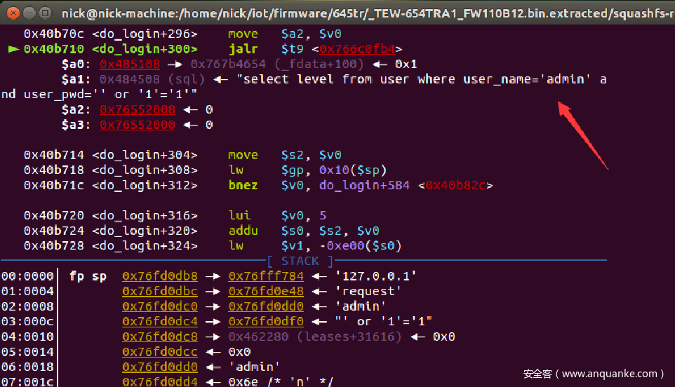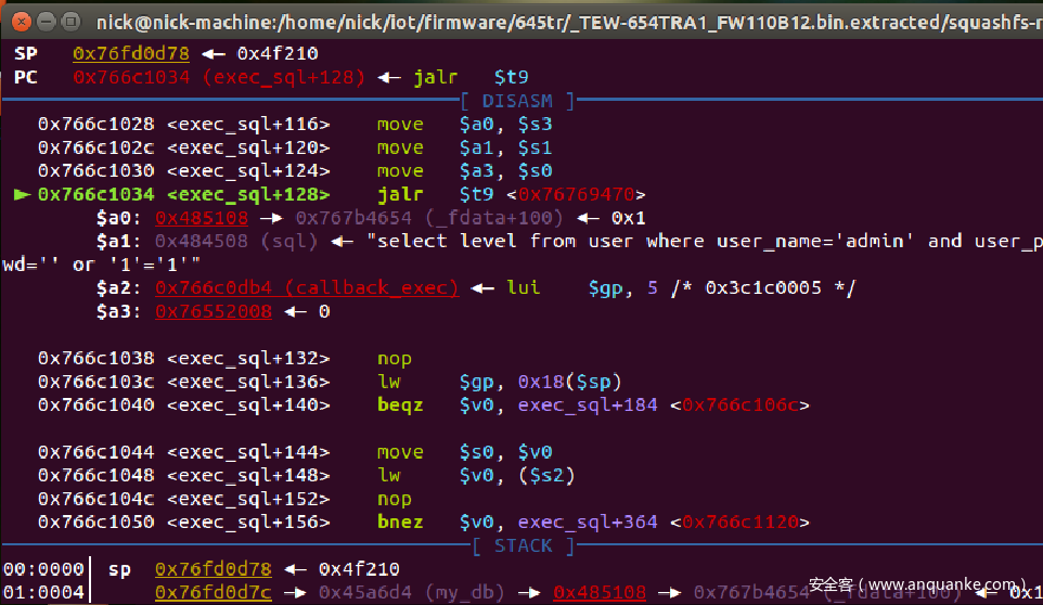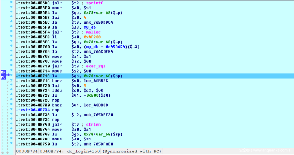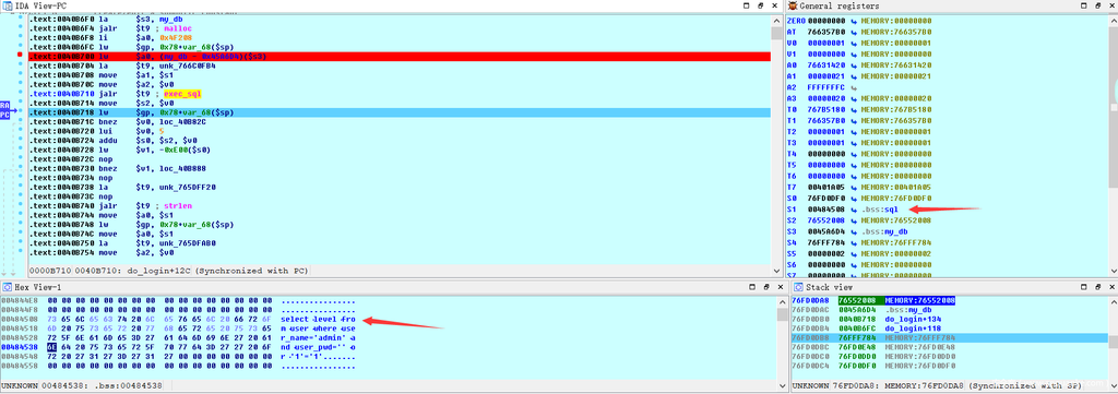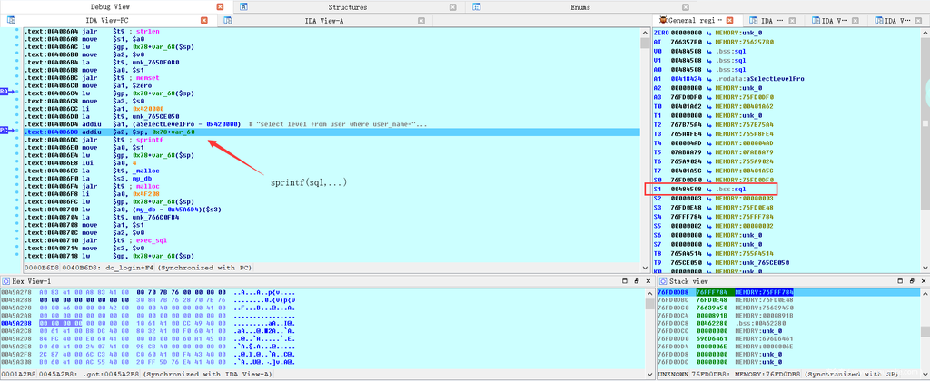继续往下分析,又有一个危险函数 sprintf ,这里会将用户名和密码格式化一个 sql 语句到 bss 段的 sql 变量,所以按理说如果输入的 user_name 或者 user_pass 过长,那么这里也是存在一处 bss 溢出的。