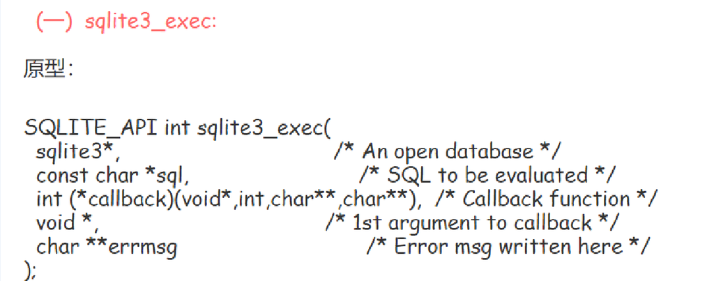 - 第一个参数为经过 sqlite3_open 函数返回的指向数据库的指针。