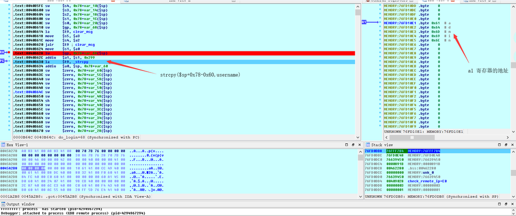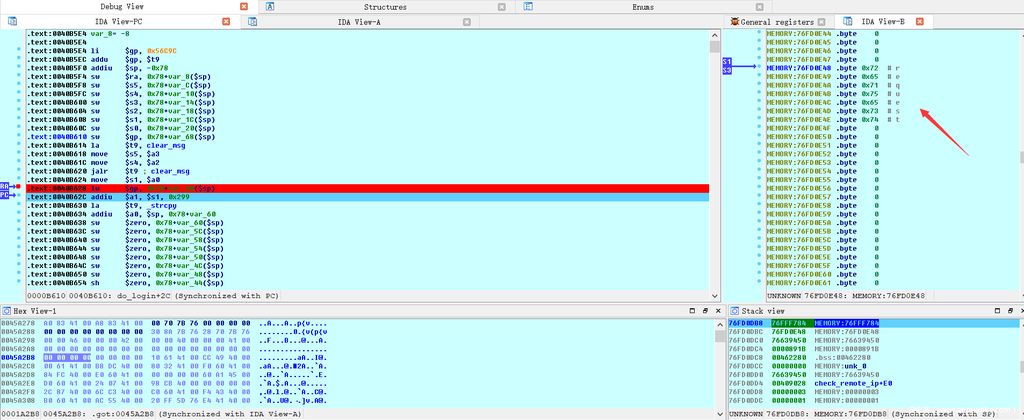 同样在执行第二个 strcpy 函数之前,在右边的 general register 窗口中跟进 a1 寄存器的值(在 a1 寄存器上右键,Jump in a new window)