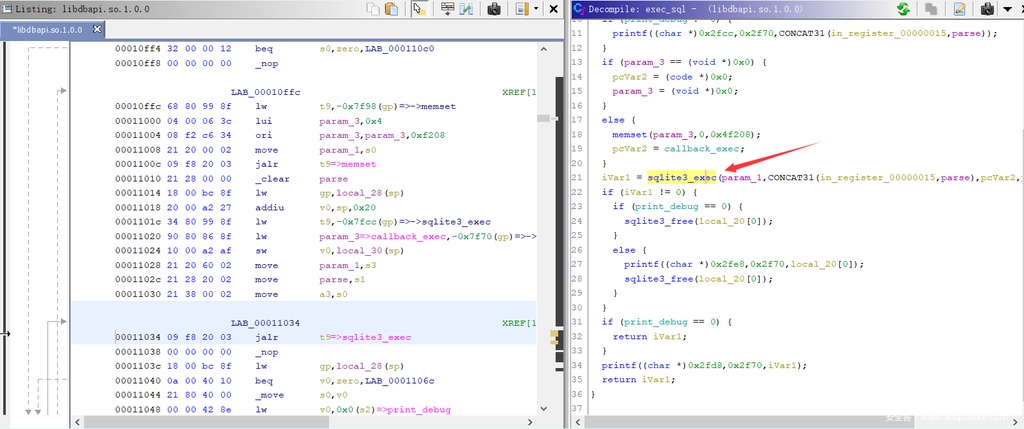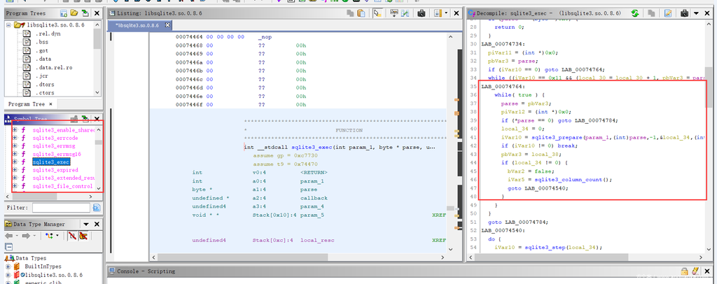 继续将他放到 Ghidra 中分析,在左边的导出表 Exports 中找到 sqlite3_exec 函数
