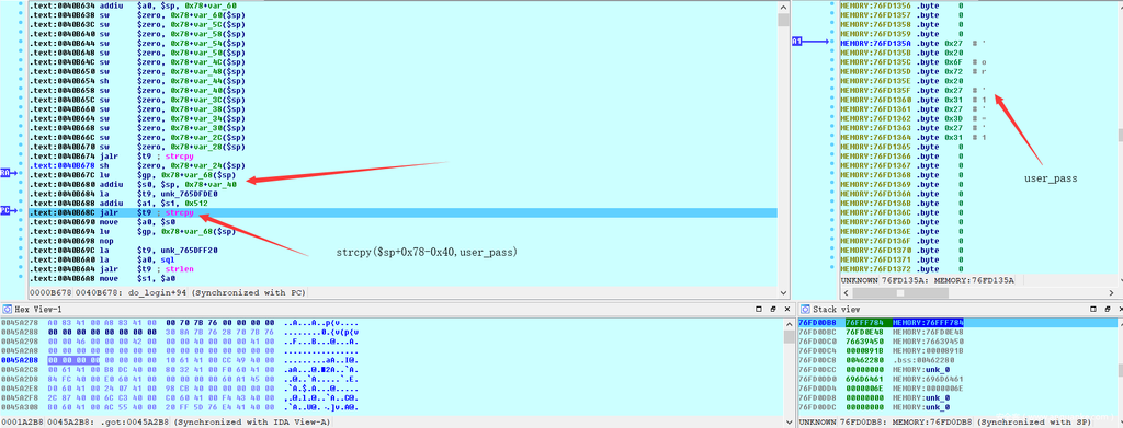 同样使用 Ghidra 9.0 的反汇编窗口中也可以很清楚看到这个漏洞,*(iParm1 + 0x299) 和 *(iParm1 + 0x512) 分别为传入的 user_name 和 user_pass