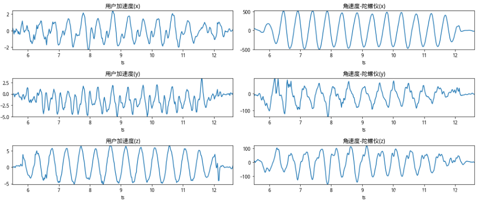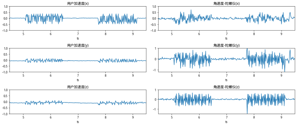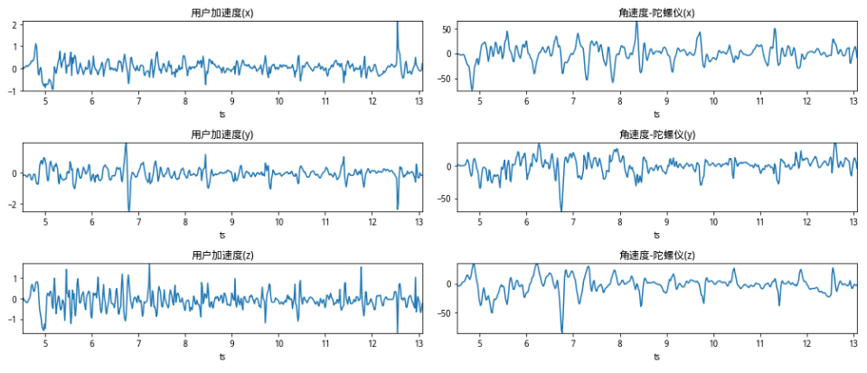图中从上至下依次对应的操作是:手机静止、手机震动、手机摇摆和正常点击操作。从上图可以看出,静止时传感器仍然存在轻微的抖动,震动时的传感器的波动更有规律性,摇摆中的传感器数据像极了正弦波,而正常的点击操作由于手指的点触操作会带来加速度的陡升/陡降。从这里可以看出,要区分传感器数据是否由人类产生,更准确的说:某次滑动或点击的交互操作时否由当前传感器产生,正是很适合由机器学习来判断的二分类问题。