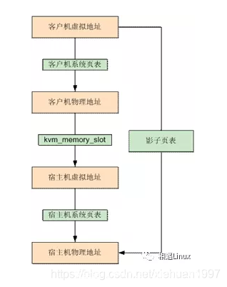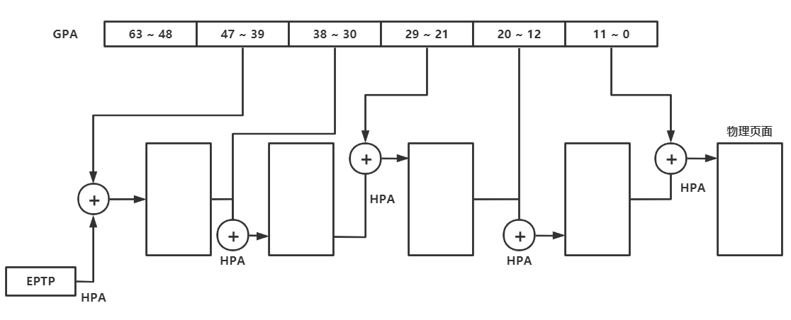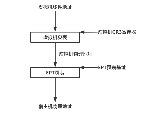 GVA(虚拟机虚拟地址) -> GPA(虚拟机物理地址) -> HVA(宿主机虚拟地址) -> HPA(宿主机物理地址)