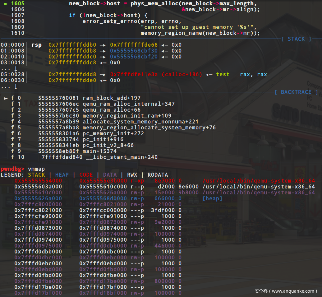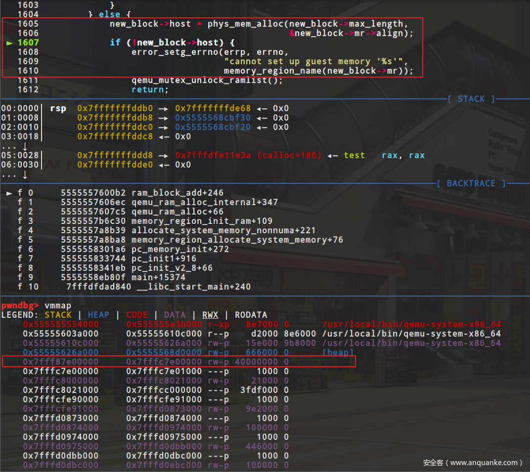 在之前我们使用qemu进行操作的时候都会加一个-m的选项,-m后面对应着我们给虚拟机分配的内存。并且我们也可以在动调的时候查找到这块内存,如图所示: