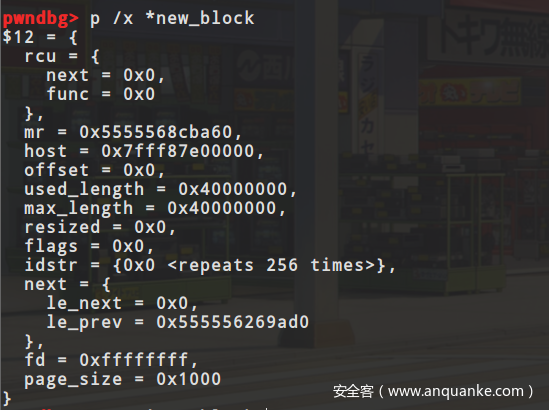 调用这个函数来给ram分配真正的内存,对应的会生成一个ram_block结构,这个结构里指明了生成的内存的地址,在ram_list中的偏移,以及它对应的memoryregion,我们可以看一下最后生成的ram_block结果,如下图所示