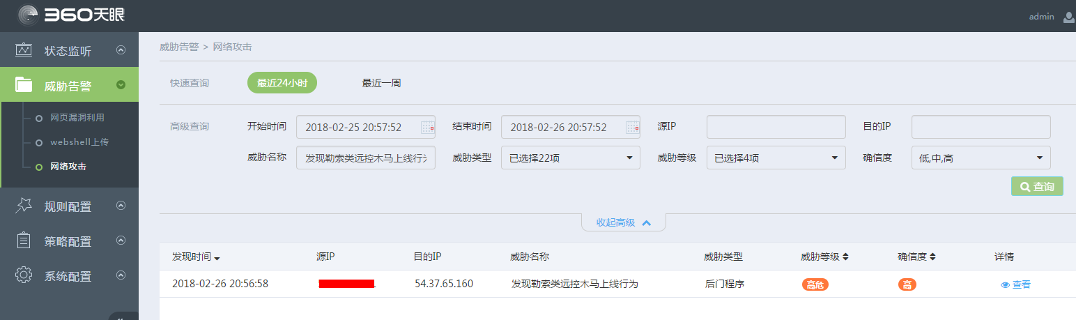 360新一代威胁感知系统的流量探针已经加入了对勒索攻击中的远控木马上线包的检测,请尽快将规则升级至最新版本:3.0.0226.10639,对应规则ID:0x4e8b,规则名称:发现勒索类远控木马上线行为,并确认该条规则已经开启。