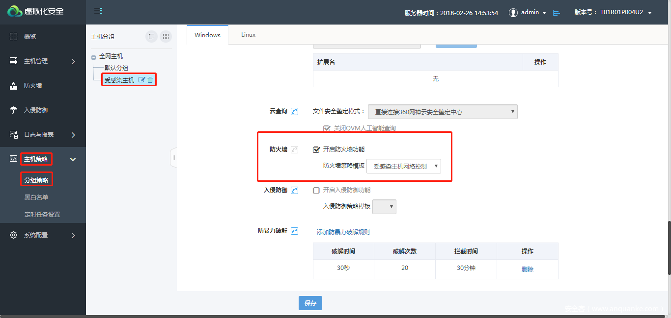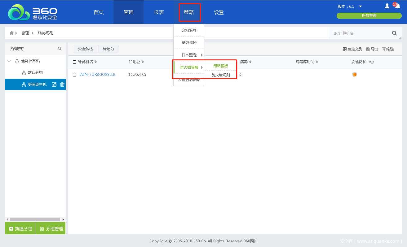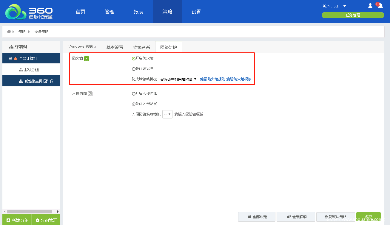 - 在主机策略-分组策略中,针对已感染设备分组,启用防火墙功能并下发防火墙策略模板