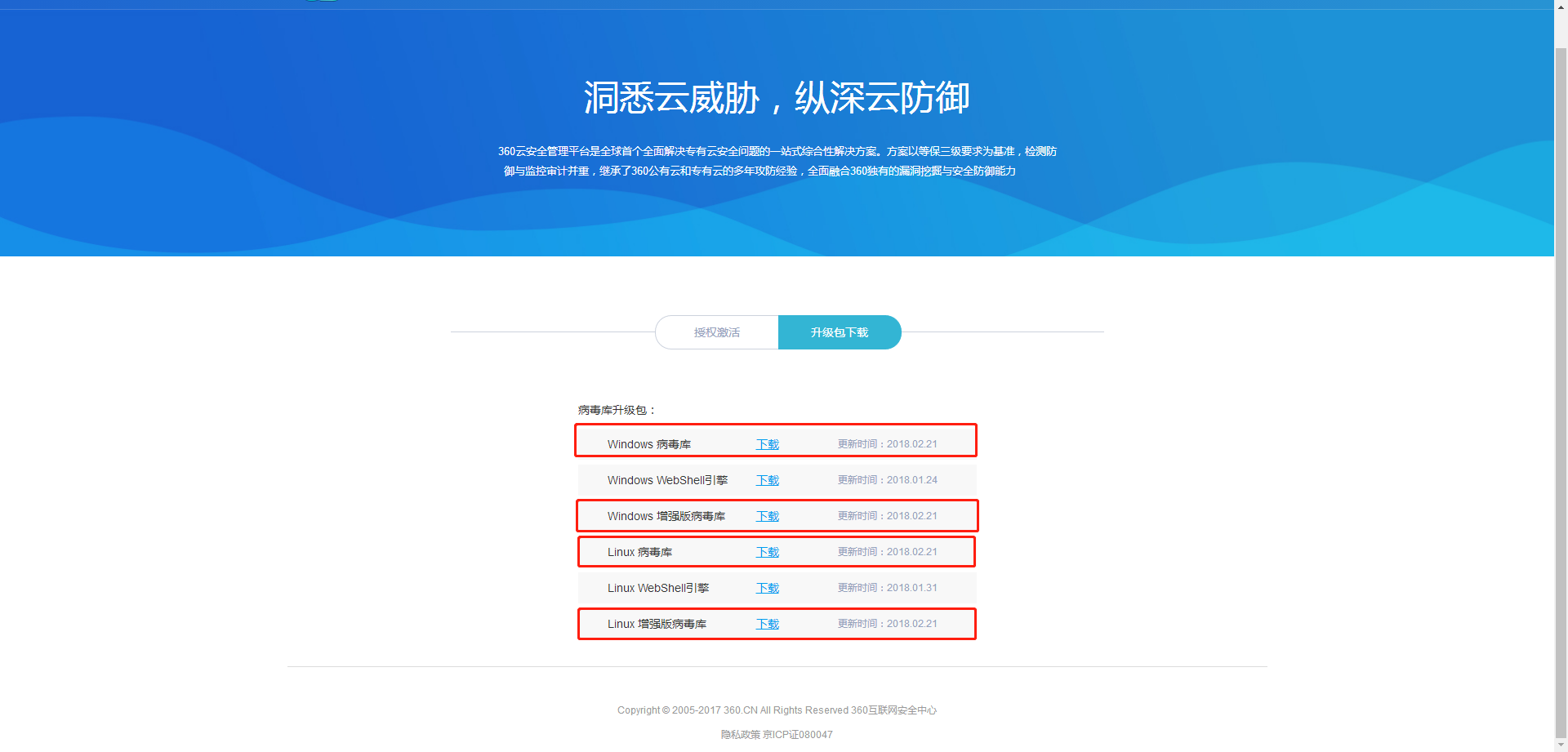 注:若已开通增强版防病毒引擎,请使用windows 病毒库增强版及Linux 病毒库增强版更新包更新。