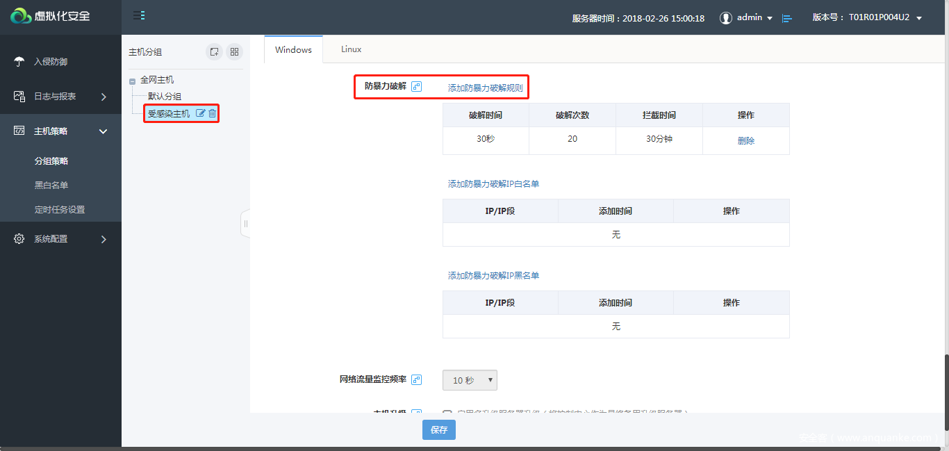 - 在主机策略-分组策略中,针对受感染主机分组,编辑防爆力破解规则