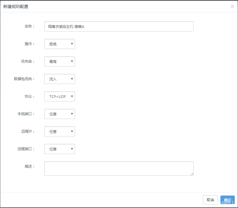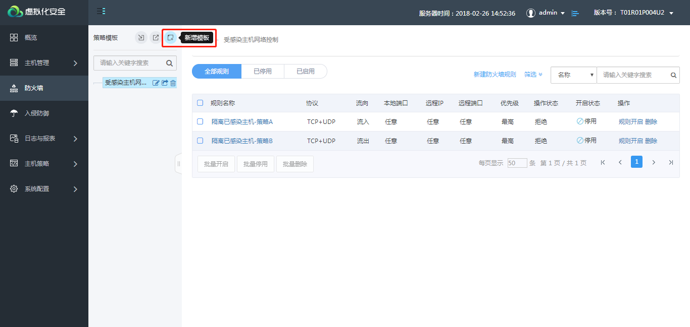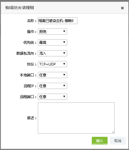 配置方法:使用虚拟化安全(轻代理)防火墙功能对已感染设备进行隔离,使用该功能需有防火墙功能模块授权。