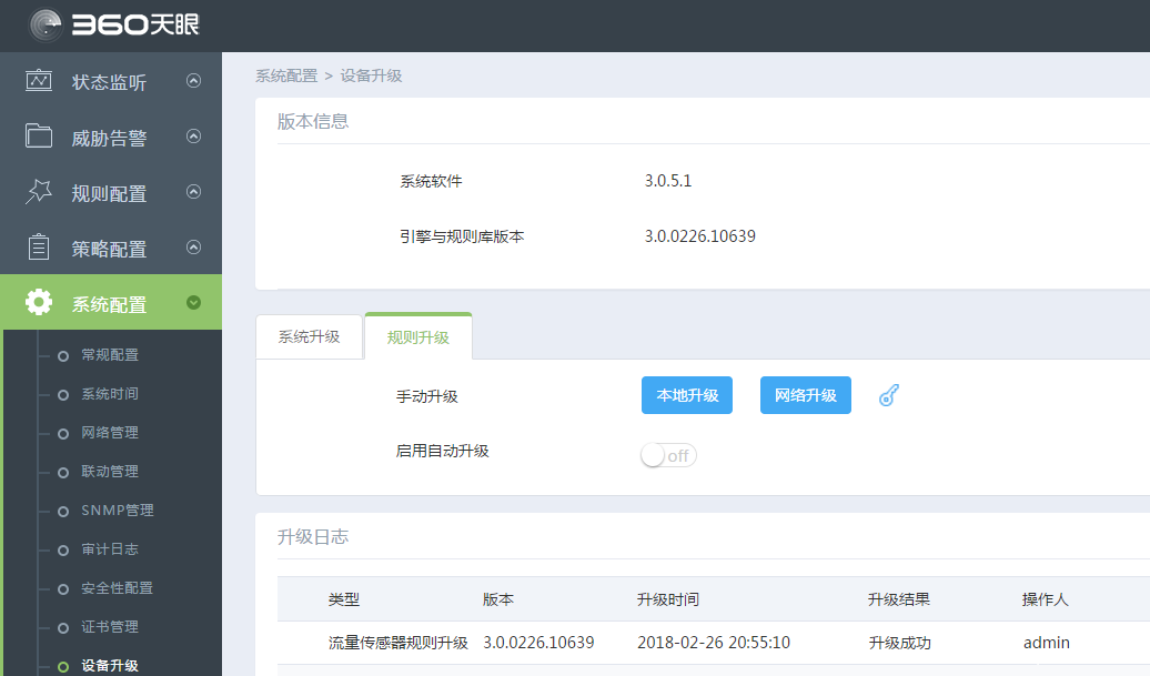 规则升级方法:请在流量探针设备上依次选择,“系统配置”-“设备升级”-“规则升级”,然后选择“在线升级”或“离线升级”。