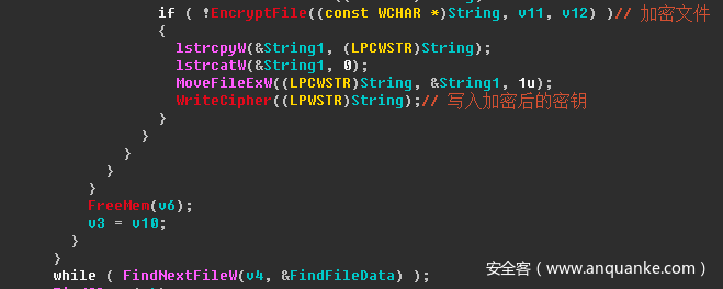 初始化完成后开始进入加密流程,病毒会遍历全盘,在排除样本中不加密文件夹列表后,使用随机生成的公钥加密其他所有文件,之后将之前生成的机器唯一标识写入文件末尾。