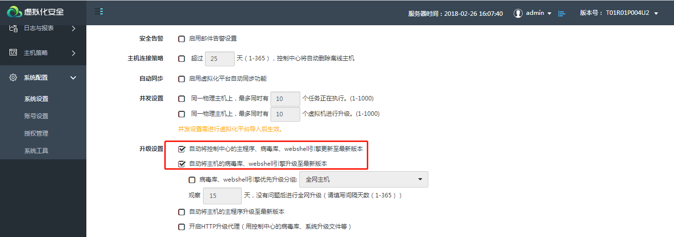 可自定义配置“自动将控制中心的主程序、病毒库、webshell引擎更新至最新版本”、“自动将主机的病毒库、webshell引擎升级至最新版本”