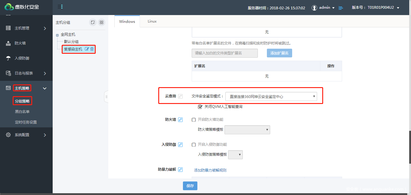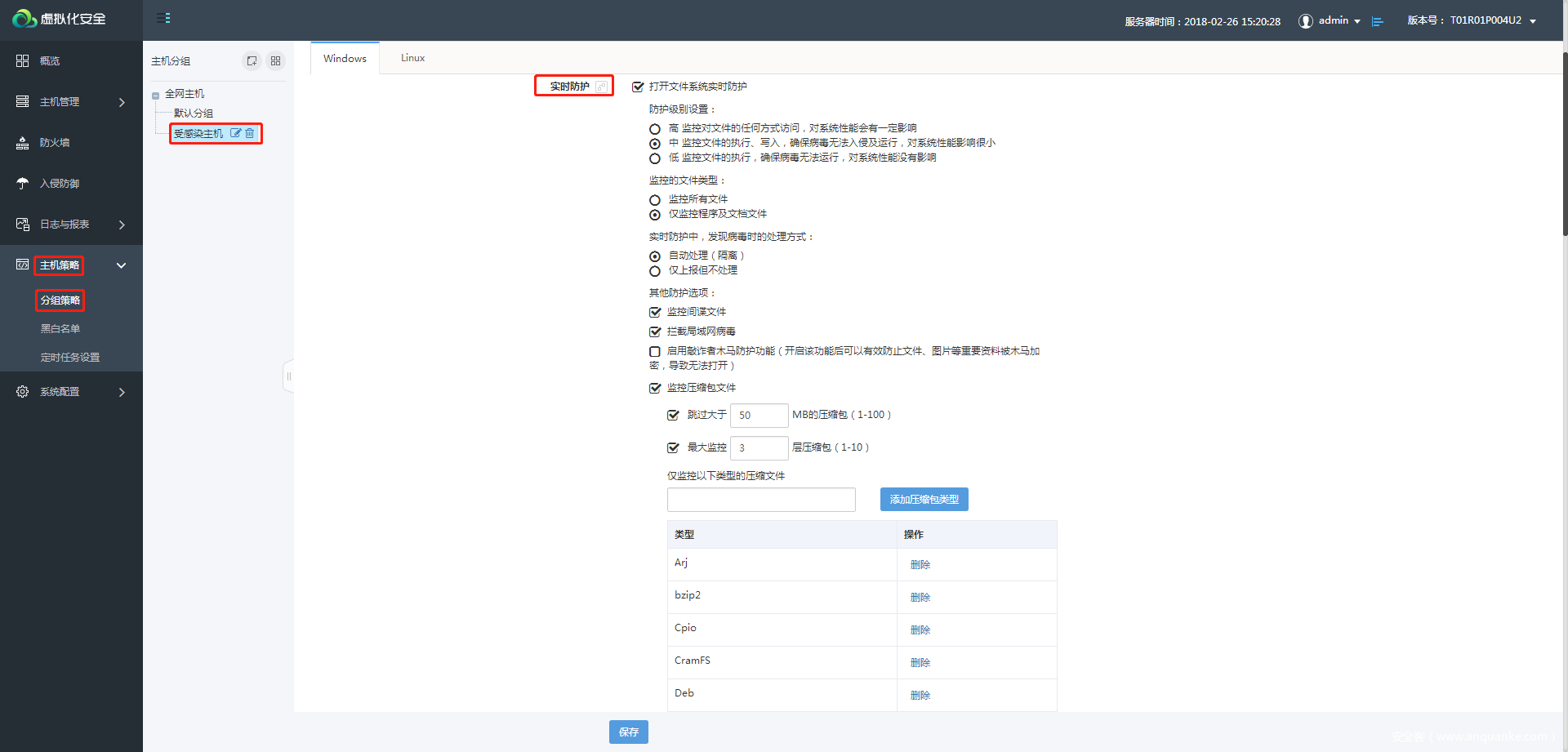 - 在主机策略-分组策略页面,针对受感染主机的分组,开启实时防护功能,并自定义实时防护相关设置,使用该功能需有防病毒功能模块授权。