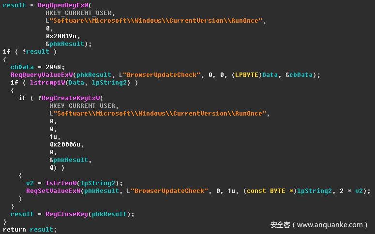勒索样本在运行后首先判断%LOCALAPPDATA%或%APPDATA%环境变量是否存在,如果存在则将自身复制到%LOCALAPPDATA%或%APPDATA%目录,之后将复制后的路径写入:HKEY_CURRENT_USER\\Software\\Microsoft\\Windows\\CurrentVersion\\RunOnce\\BrowserUpdateCheck 从而实现开机启动