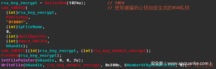 生成RSA私钥并使用硬编码公钥加密,之后将加密后的密文转换为ASCII码,最后将密文写入%ALLUSERSPROFILE% 变量路径中。