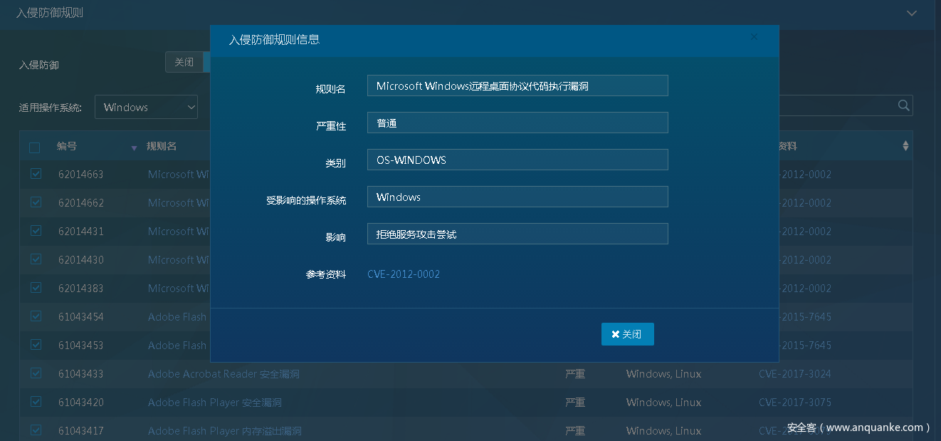 系统默认根据“适用操作系统”来显示对应的入侵防御规则:例如,适用操作系统为”windows”时,入侵防御规则页面会显示windows下的入侵防御规则。