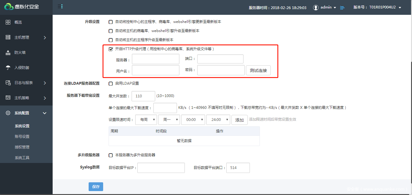 方法二:当控制中心无法连接公网时,可配置HTTP代理服务器升级控制中心病毒库