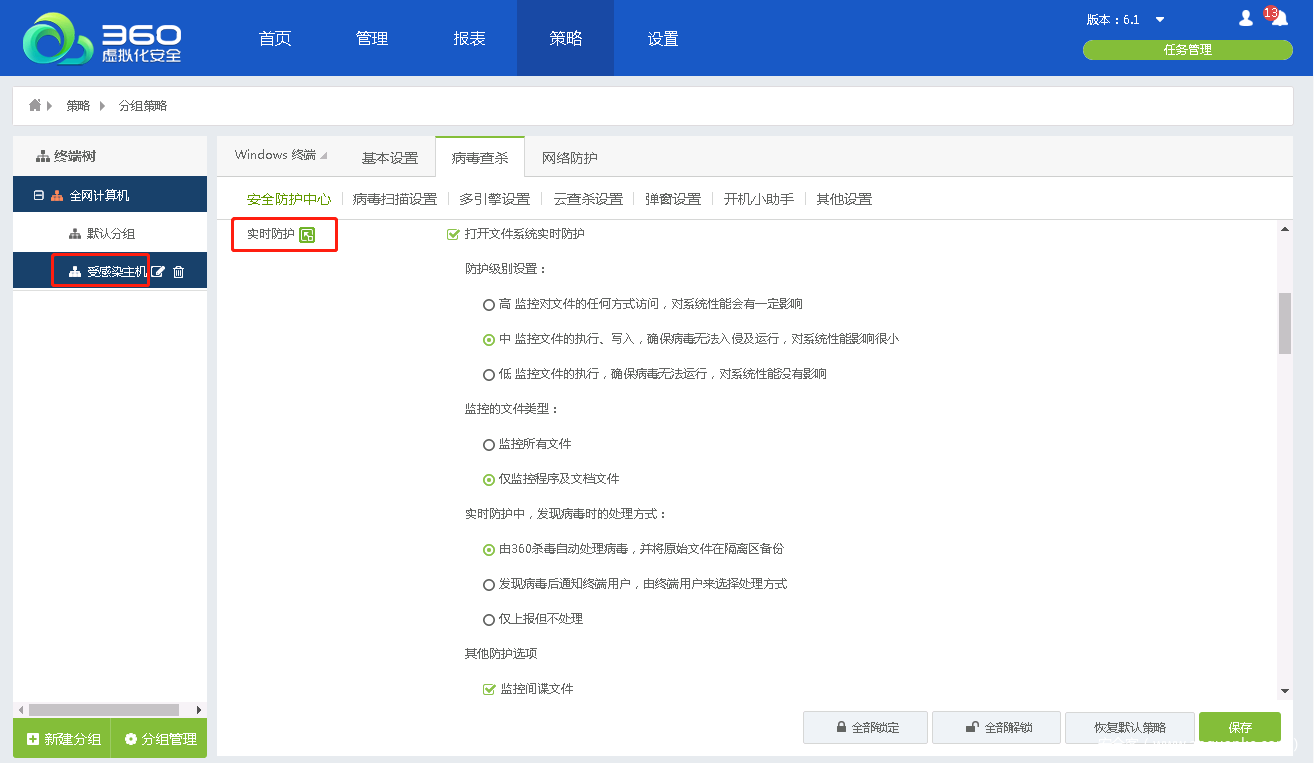 - 在主机策略-分组策略页面,针对受感染主机的分组,开启实时防护功能,并自定义实时防护相关设置。