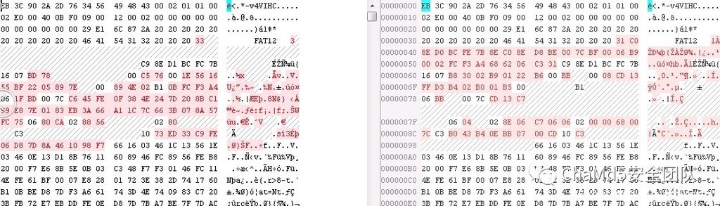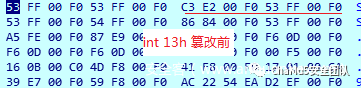 使用WinHex发现了镜像中还有一些碎片文件可以通过特征恢复,但并没有什么发现,进一步观察发现镜像的mbr和原版dos相比被篡改了其中一段