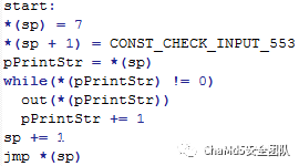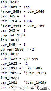 其中最难的是subleq通过指令修改了自身指令,这种情况通过指令操作的target address写入了已经识别为指令的地址区域列出,进一步可以发现这些自身修改的指令主要用于指针操作*(%a) = %b, %b = *(%a), jmp *(%a)等操作,可以理解通过修改自身指令替换简单mov中的操作地址,来实现指针访问