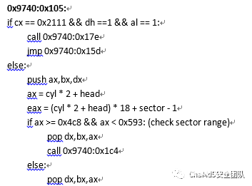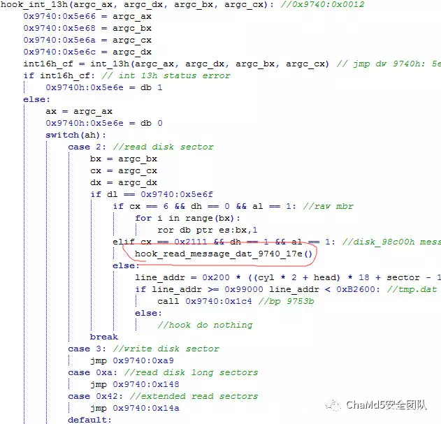 继续跟进,可以发现进入伪造的int 13h函数会先记录int 13h所有的参数并执行真正的系统服务,然后对参数进行比对进入相应的handler,主要是读扇区时,hook解码原版mbr以及在打开message.dat文件时会call tmp.dat中的函数,写扇区时也会有对应的handler