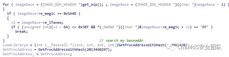 后门下载器加载库函数从ldr链表中遍历模块和模块函数,使用Hash来获取API定位,此后的API都用这种方法遍历,由于是病毒经典使用方法,可以搜到hash表,没有搜索到的可以动态修改hash参数来取结果
