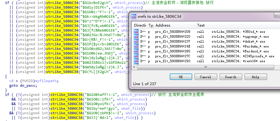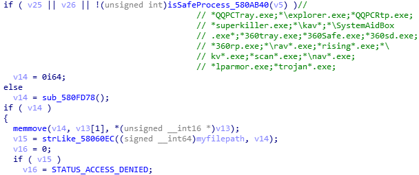 在后置操作post_flt_580F400中,除放行主流浏览器、安全软件安装包外,还针对安全软件和explorer对\drivers*的打开进行了过滤,目的是为了阻止安全软件的驱动加载: