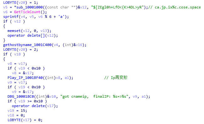 DLL模块回连主控服务器,通过与主控服务器进行通信完成其所定义之功能, 主控服务器的IP地址获取比较有趣,先通过解析ca.jp.ix[a-e].cose.space域名得到返回的假IP,再通过内部换算拿到实际的IP地址。