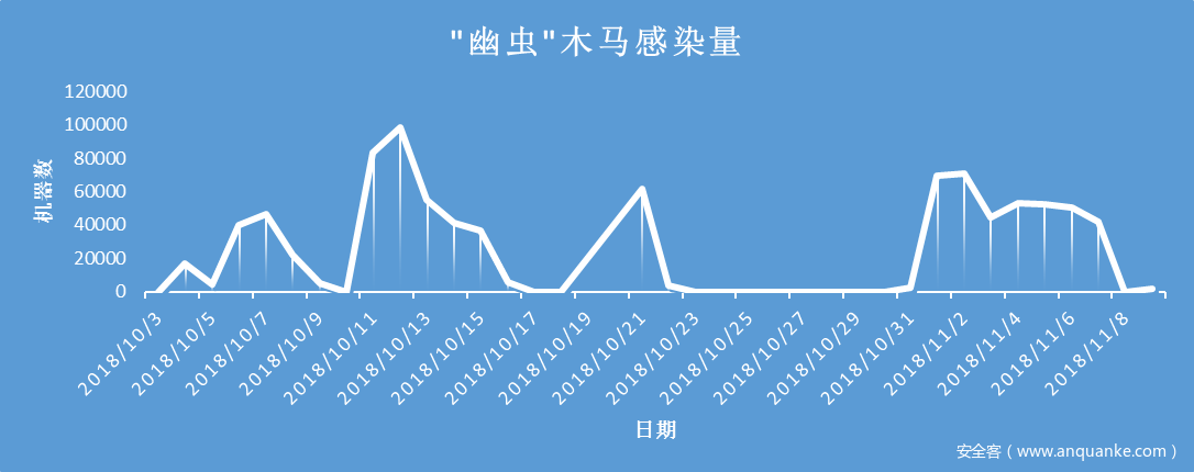 自2018-10-3起至2018-11-9止,该家族样本共计感染次数91万,所有数据按照mac地址去重后共计41万。如下图所示,传播最高峰出现在10月12日,仅这一天就该家族木马就感染了近10万次。
