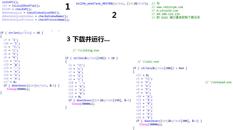 这里以下载者功能为例进行简单分析,其工作流程为——判断当前工作环境,避免运行于分析环境或者沙箱中,接着与CC服务器通信获取下载任务,之后下载执行: