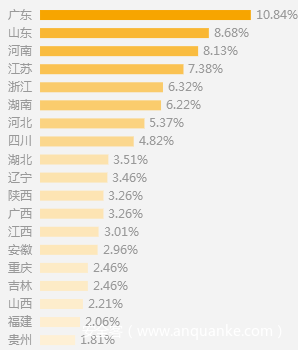 地区感染量占比Top情况如下图所示,可以看到样本对广东、山东、河南、江苏地区用户影响较大: