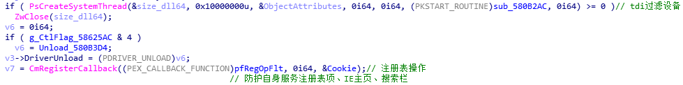 之后创建TDI过滤设备\\Device\\CFPTcpFlt,该设备会挂接到\\Device\\Tcp上,用以监控TCP数据包,接着创建注册表操作回调例程: