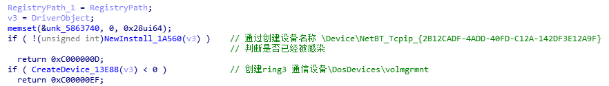 以X64版为例。驱动入口处首先判段机器是否已被感染,之后创建用以与应用层模块进行通信的设备“volmgrmnt”,同时创建%SystemRoot%\temp\MpCz01.tmp文件作为感染标志